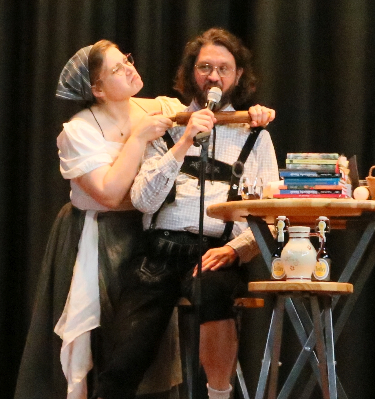 «Oim a Veschper en da Rucksack schwätza» kann jeder gscheite Schwob, aber unseren Dialekt auch nach allen Regeln der Kunst in Schriftform zu bringen, schaffen nur die Schöngeister unter den Schaffern. Der Laizer Autor und Sprachwissenschaftler Johannes F. Kretschmann und die «kongeniale Schauspielerin» (SchwäZ) Hanna D. Stauß aus Inneringen rezitieren mit szenischem Gebäffzg altehrwürdige und zeitgenössische schwäbische Dichterinnen und Dichter wie Sebastian Blau, Michel Buck, Ingrid Koch und Hugo Brotzer. Dazwischen verlautbaren sie die liederlichsten Schmährufe aus der Schimpfwörterei von Thaddäus Troll und tragen eine «Goischtergschiicht» aus Kretschmanns Feder vor. Zum dramatischen Finale schlüpfen sie in die Rolle von Adam und Eva beim Sündenfall aus Sebastian Sailers «Schwäbischer Schöpfung». Auch die neueste Tüftelei aus der schwäbischen Küche, vegane Kochrezepte zünftiger Klassiker, werden anschaulich schmackhaft gemacht. Die kurzweilige «Komeed» taugt für Jung und Alt, fiar Bodaständige ond Reigschmeckte.